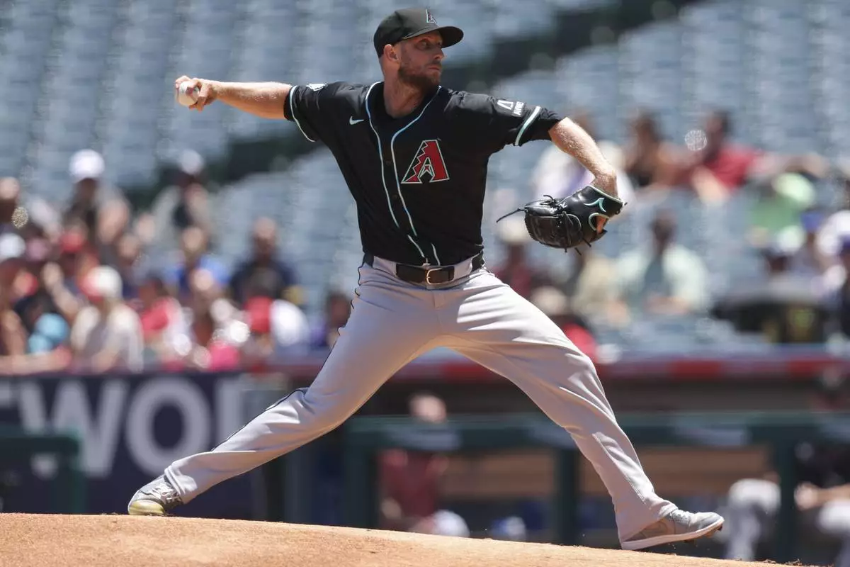 Arizona Diamondbacks pitcher Merrill Kelly throws to a Los Angeles Angels batter during the first inning of a baseball game in Anaheim, Calif., Sunday, July 13, 2025. (AP Photo/Jessie Alcheh)