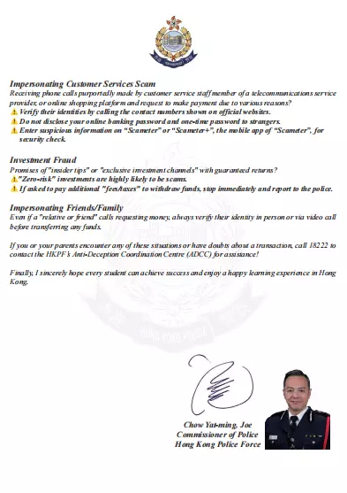 The letter issued this time has added Simplified Chinese version and English version, with the signature and photo of Commissioner of Police, Chow Yat-ming (Joe), introducing the common features of scams and ways of seeking help, helping students and their parents stay away from scams.