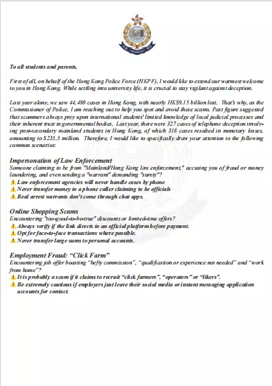 Chow Yat-ming first extends a warm welcome to students and their families for studying in Hong Kong in the letter. He also introduces the data from HKPF that there were 44,480 cases of scams in Hong Kong alone last year, with nearly HK$9.15 billion lost.