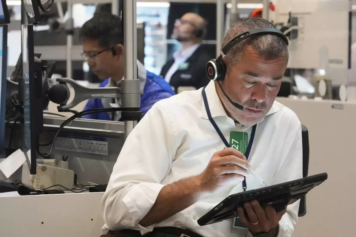 Robert Greason works on the floor at the New York Stock Exchange in New York, Monday, July 14, 2025. (AP Photo/Seth Wenig)