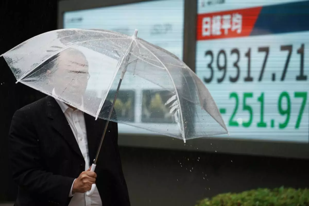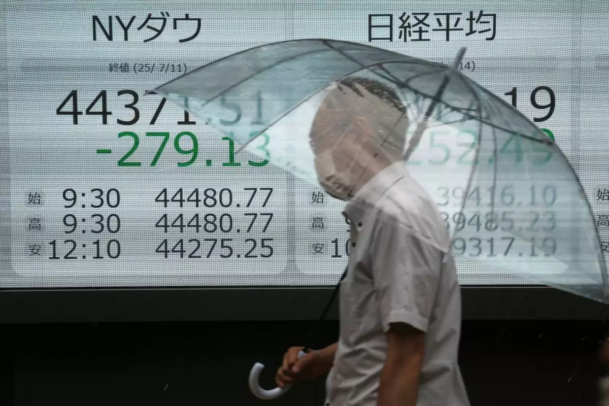 A person walks in front of an electronic stock board showing Japan's Nikkei index at a securities firm Monday, July 14, 2025, in Tokyo. (AP Photo/Eugene Hoshiko)
