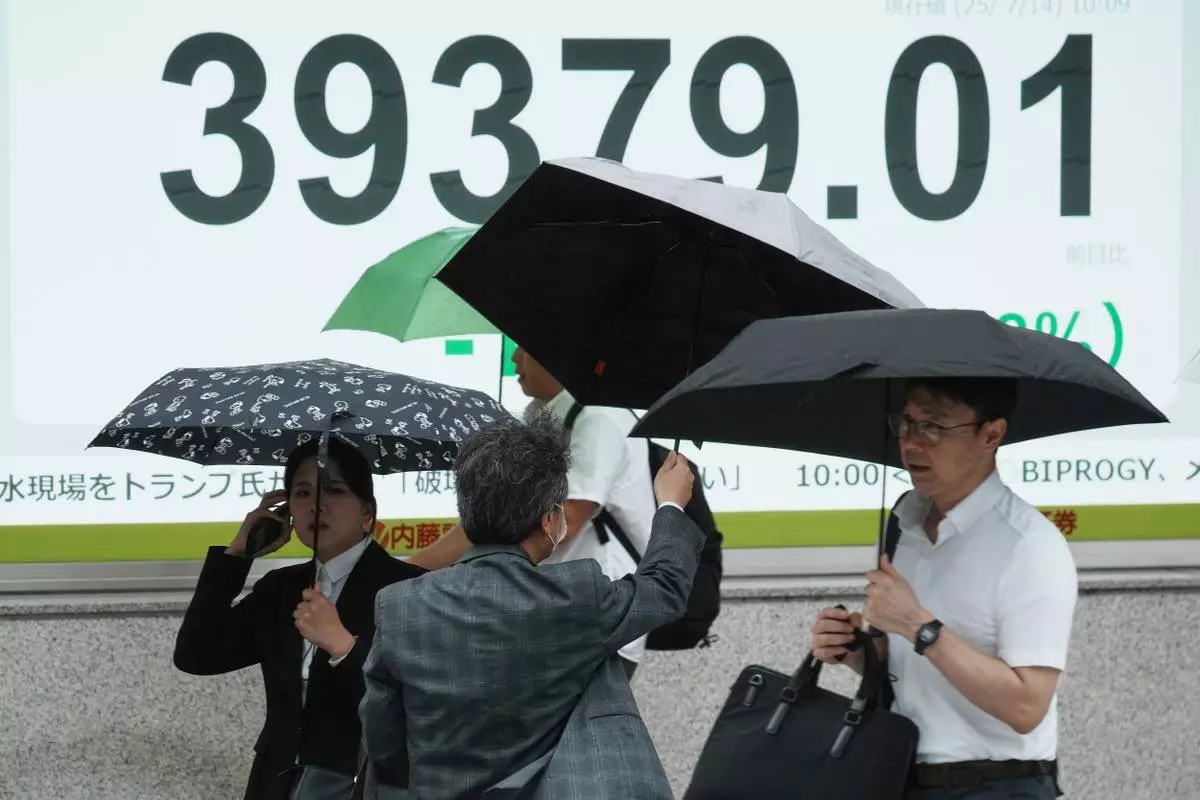 People walk in front of an electronic stock board showing Japan's Nikkei index at a securities firm Monday, July 14, 2025, in Tokyo. (AP Photo/Eugene Hoshiko)