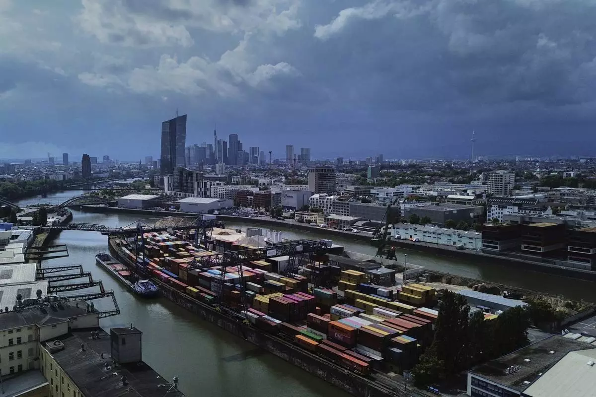 Containers are piled up at a cargo terminal in Frankfurt, Germany, Monday, July 14, 2025. (AP Photo/Michael Probst)