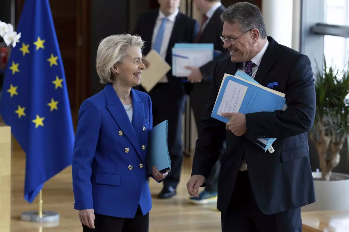 FILE - European Commissioner for Trade and Economic Security Maros Sefcovic, right, speaks with European Commission President Ursula von der Leyen, during the weekly meeting of the College of Commissioners at EU headquarters in Brussels, April 9, 2025. (AP Photo/Omar Havana, File)