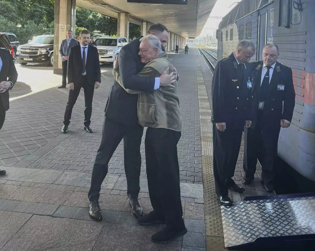 In this photo provided by the Ukrainian Presidential Press Office, Andriy Yermak, the head of Ukraine's Presidential Office, left, meets with United States Special Envoy for Ukraine and Russia, Joseph Keith Kellogg, at a train station in Kyiv, Ukraine, Monday, July 14, 2025. (Ukrainian Presidential Press Office via AP)