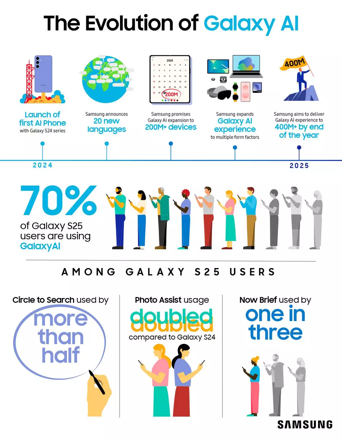 Galaxy AI adoption accelerates, with 70% of Galaxy S25 users engaging AI-powered features like Circle to Search, Photo Assist, and Note Assist