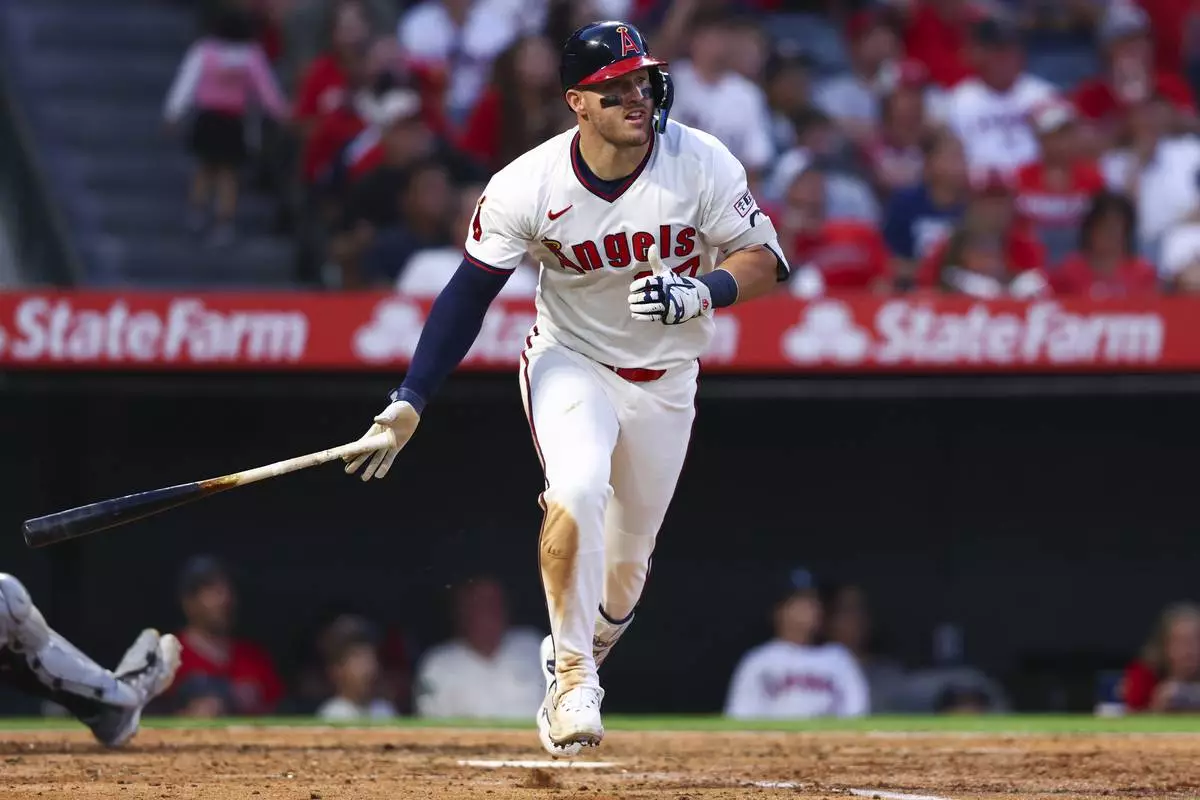 Los Angeles Angels designated hitter Mike Trout drops his bat after hitting a home run during the fifth inning of a baseball game against the Arizona Diamondbacks in Anaheim, Calif., Saturday, July 12, 2025. (AP Photo/Jessie Alcheh)