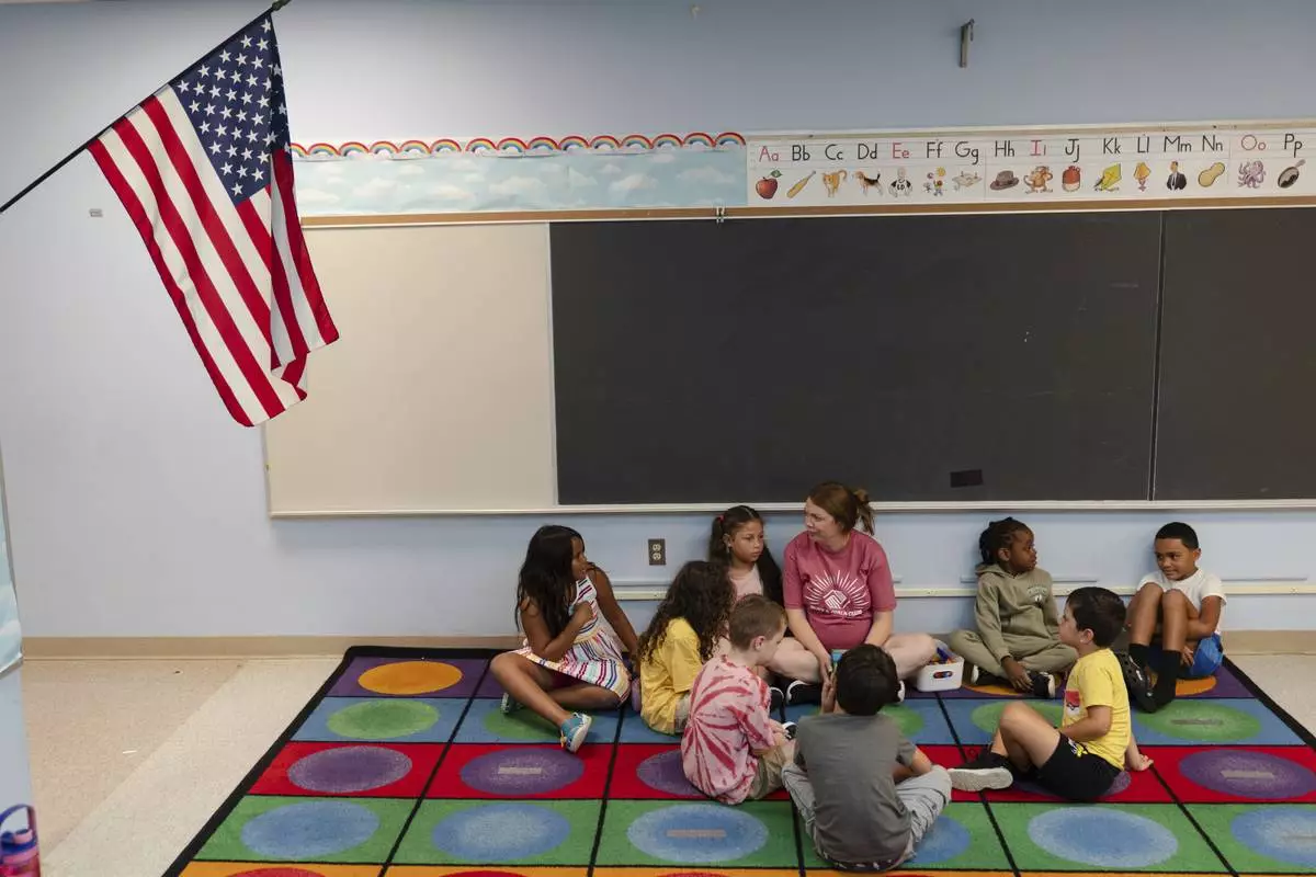 Jillian Murphy leads children in math activities during the East Providence Boys and Girls Club Summer Camp at Emma G. Whiteknact Elementary School on Thursday, July 10, 2025, in Providence R.I. (AP Photo/Sophie Park)
