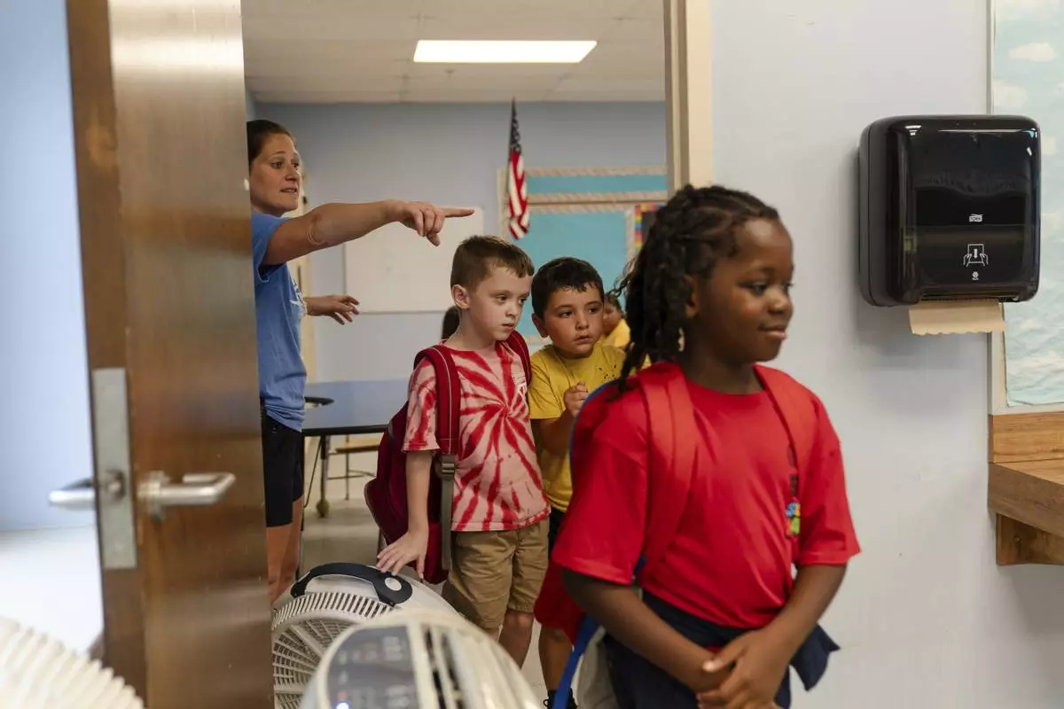 Kayla Creighton directs children to their next activity during the East Providence Boys and Girls Club Summer Camp at Emma G. Whiteknact Elementary School on Thursday, July 10, 2025, in Providence, R.I. (AP Photo/Sophie Park)