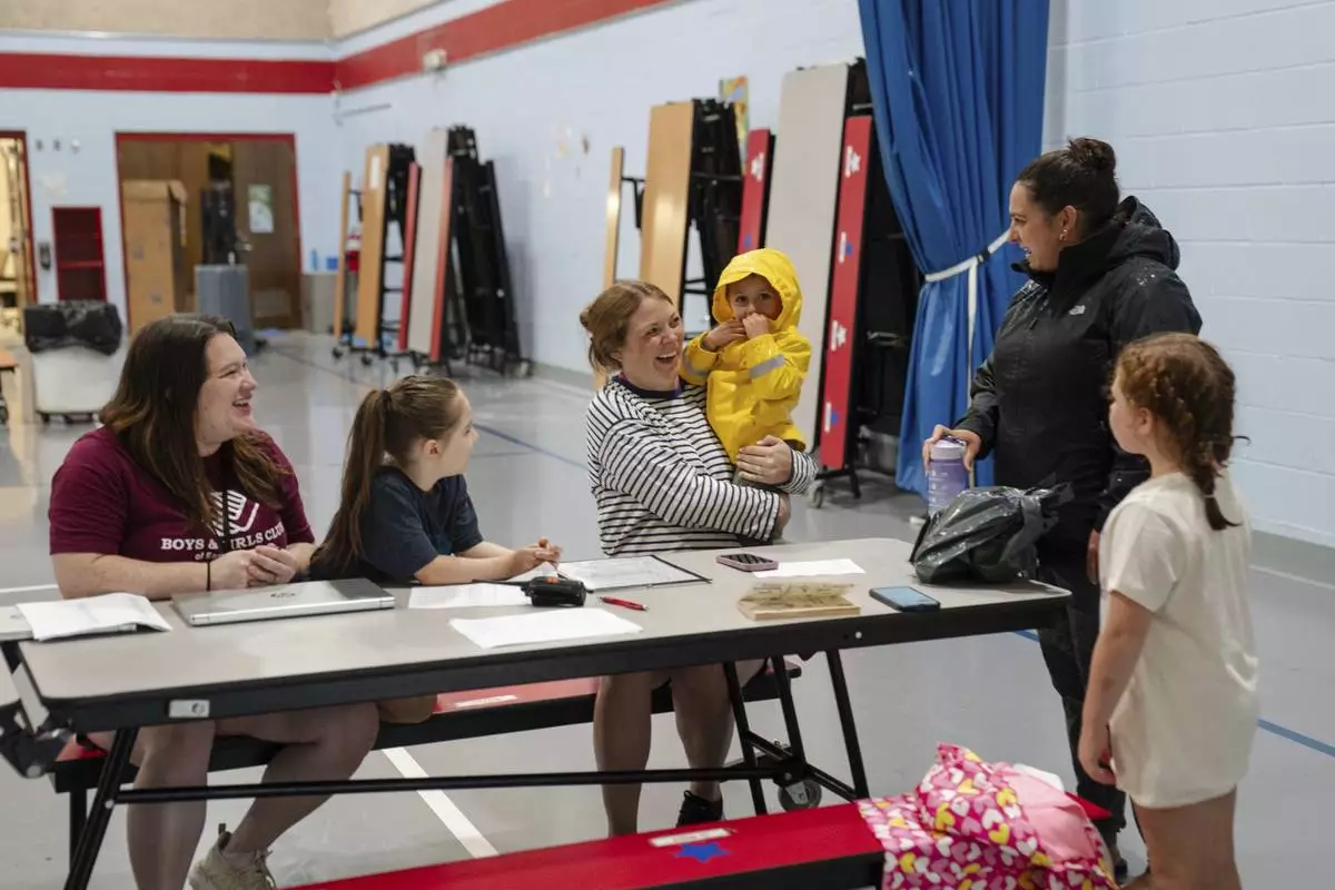 A parent drops their children off at the East Providence Boys and Girls Club Summer Camp at Emma G. Whiteknact Elementary School on Thursday, July 10, 2025, in Providence R.I. (AP Photo/Sophie Park)