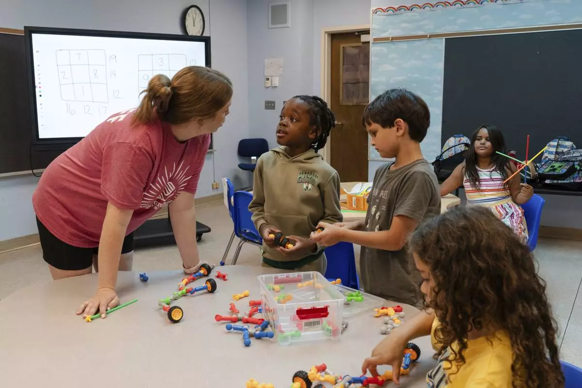 Jillian Murphy leads children in math activities during the East Providence Boys and Girls Club Summer Camp at Emma G. Whiteknact Elementary School on Thursday, July 10, 2025, in Providence R.I. (AP Photo/Sophie Park)
