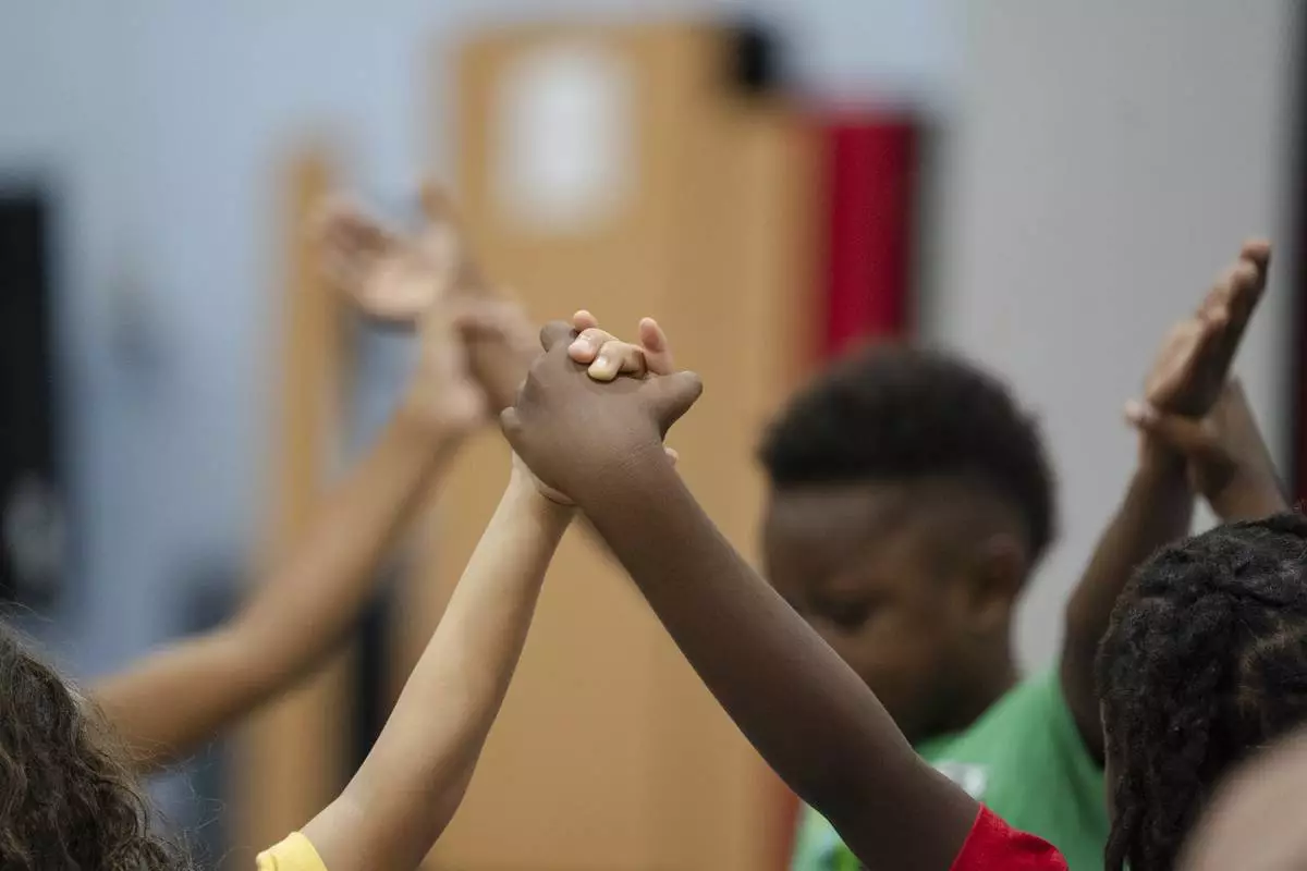 Children hold hands while participating in activities during the East Providence Boys and Girls Club Summer Camp at Emma G. Whiteknact Elementary School on Thursday, July 10, 2025, in Providence R.I. (AP Photo/Sophie Park)