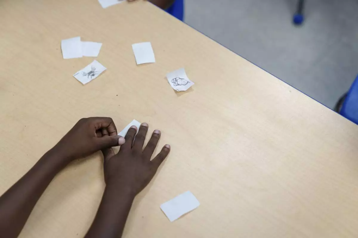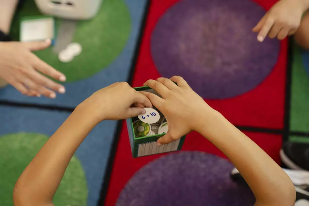 Children participate in math activities during the East Providence Boys and Girls Club Summer Camp at Emma G. Whiteknact Elementary School on Thursday, July 10, 2025, in Providence R.I. (AP Photo/Sophie Park)