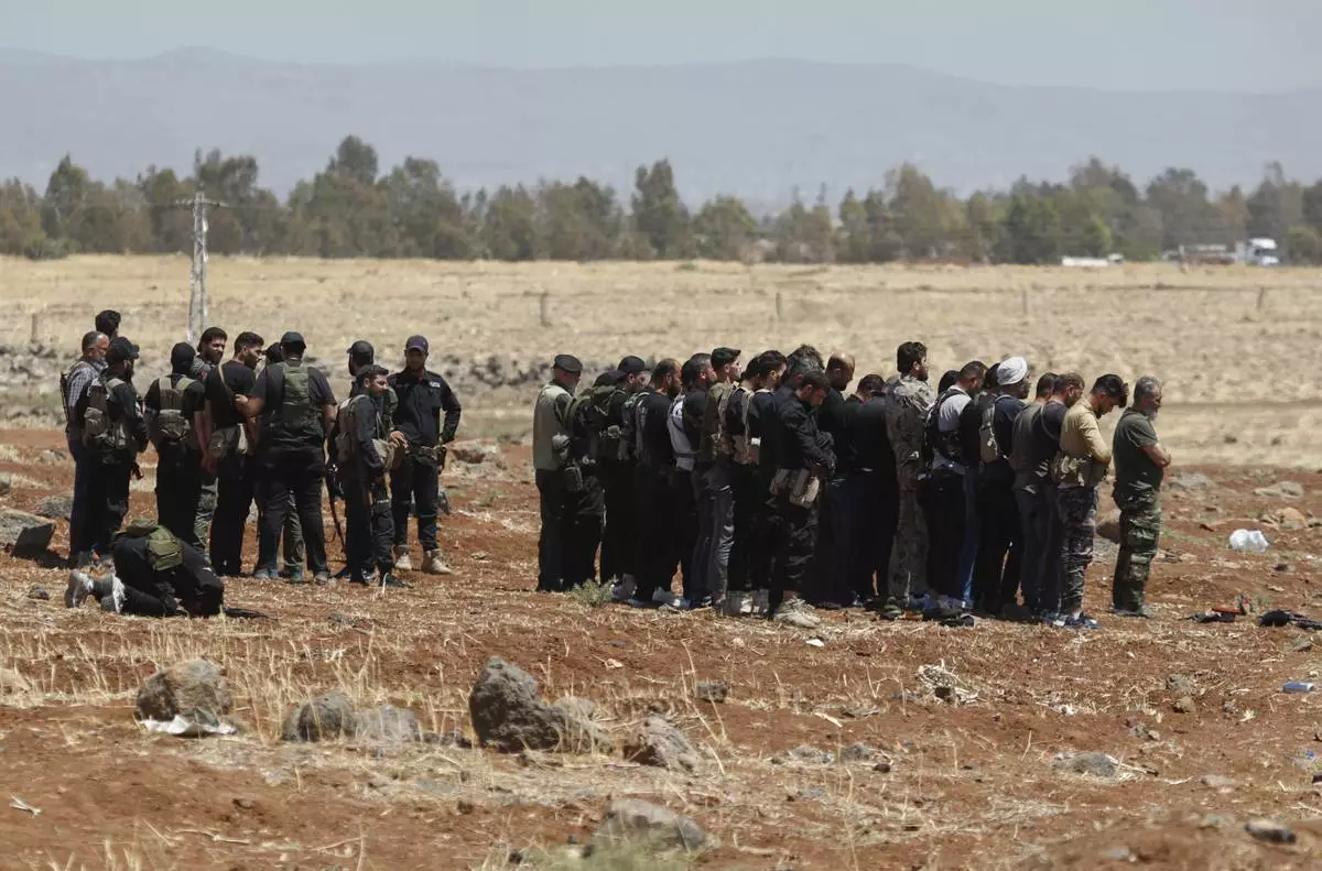 Syrian government security forces gather on the outskirts of Sweida province where clashes erupted between Druze militias and Sunni Bedouin clans, southern Syria, Monday, July 14, 2025. (AP Photo/Malek Khattab)