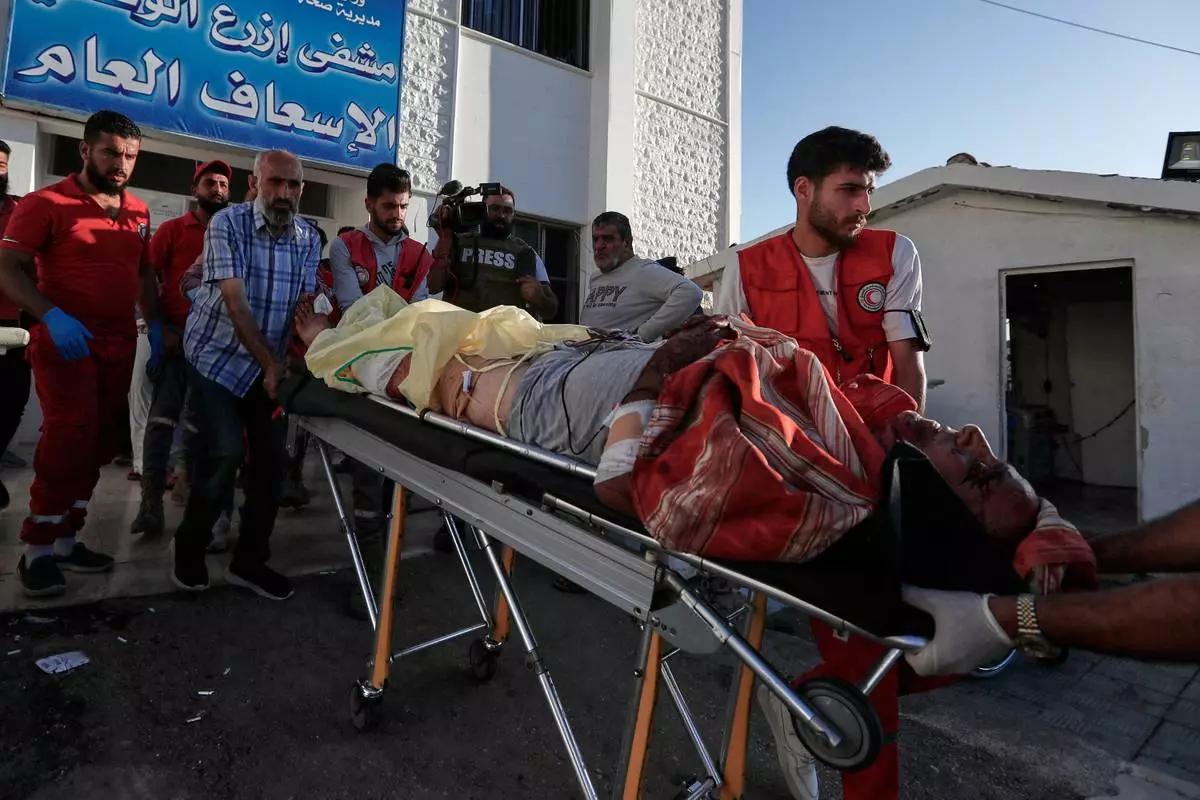 Syrian Red Crescent volunteers carry a man who was injured during clashes between Sunni Bedouin clans and Druze militias, at Ezraa hospital, southern Syria, Monday, July 14, 2025. (AP Photo/Omar Sanadiki)
