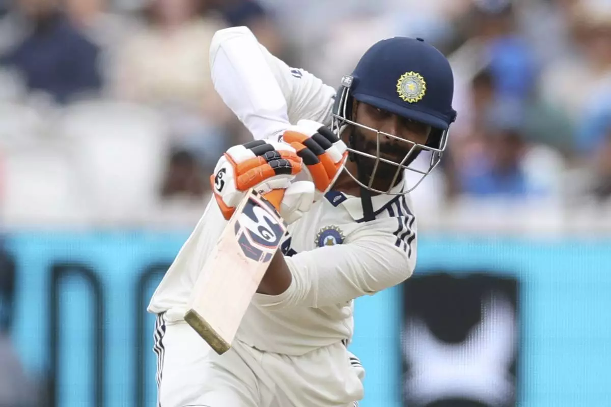 India's Ravindra Jadeja plays a shot during the fifth day of the third cricket test match between England and India at Lord's cricket ground in London, Monday, July 14, 2025. (AP Photo/Richard Pelham)
