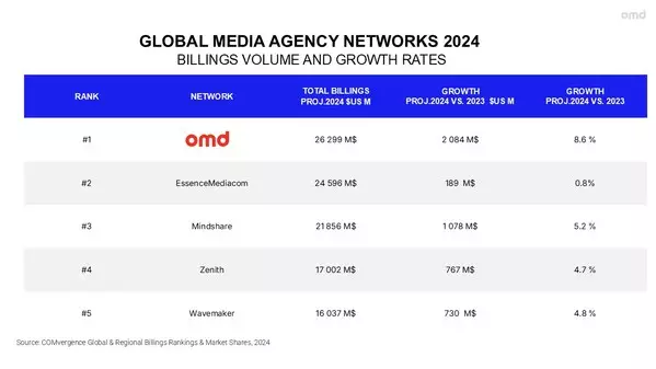 Released last week, the 2024 Global & Regional Billings Rankings & Market Shares report shows OMD with worldwide billings of approximately $26.3 billion, outperforming its nearest competitor by $1.7 billion; and a YoY growth rate of 8.6%, representing both the best rate of growth among the five largest agency networks as well as the largest net billings increase among all 20 networks included in the ranking, with approximately $2.1 billion added in 2024.