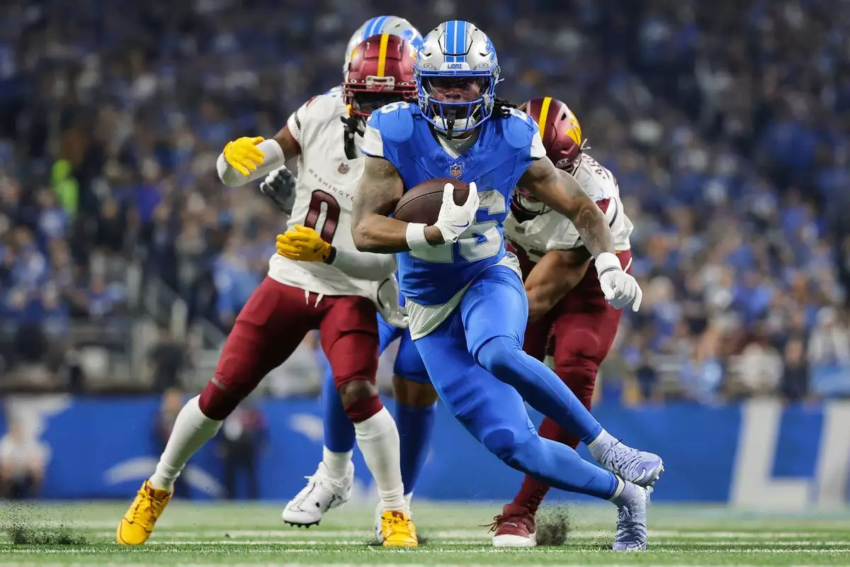 FILE - Detroit Lions running back Jahmyr Gibbs (26) runs past Washington Commanders cornerback Mike Sainristil (0) during the first half of an NFL football divisional playoff game, Saturday, Jan. 18, 2025, in Detroit. (AP Photo/Rey Del Rio, File)