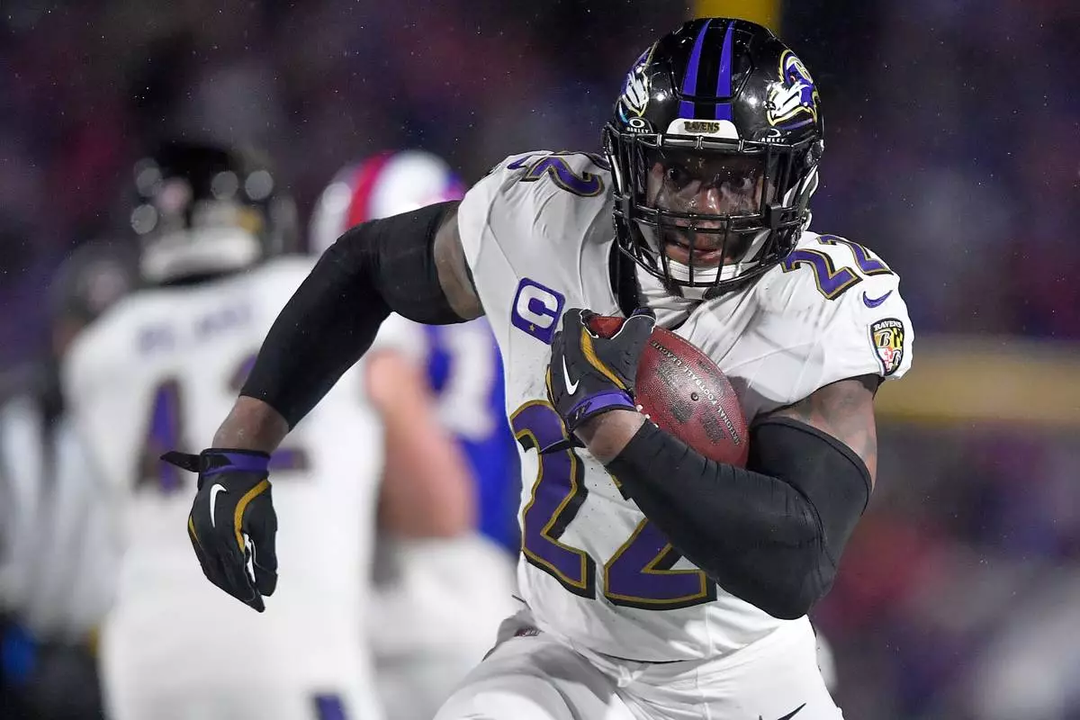 FILE - Baltimore Ravens running back Derrick Henry (22) carries the ball against the Buffalo Bills during the third quarter of an NFL divisional playoff football game, Sunday, Jan. 19, 2025, in Orchard Park, N.Y. (AP Photo/Adrian Kraus, File)
