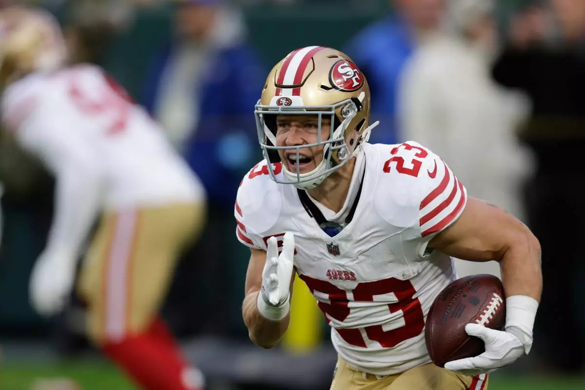 FILE - San Francisco 49ers running back Christian McCaffrey (23) warms up before an NFL football game against the Green Bay Packers on Sunday, Nov. 24, 2024 in Green Bay, Wis. (AP Photo/Matt Ludtke, File)
