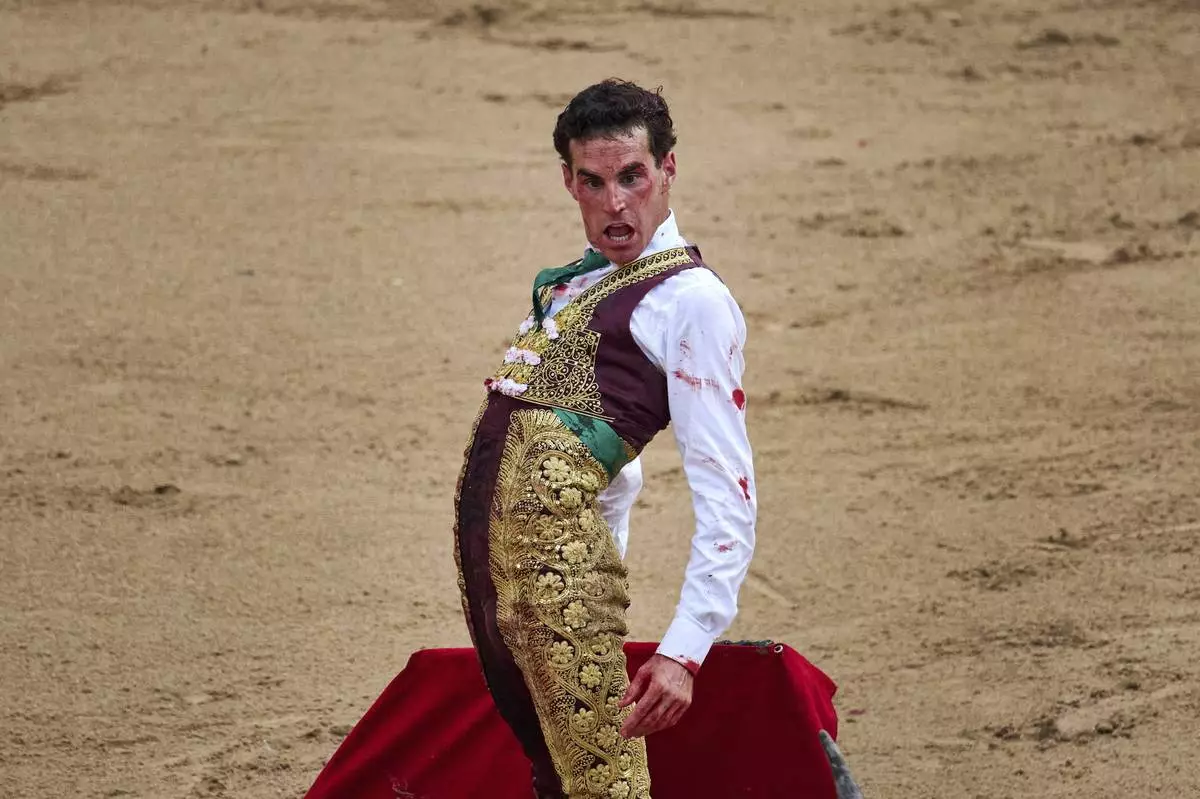 Spanish bullfighter Rafaelillo is gored during a bullfight at the San FermÌn festival in Pamplona, northern Spain, Saturday, July 12, 2025. (AP Photo/Miguel Oses)