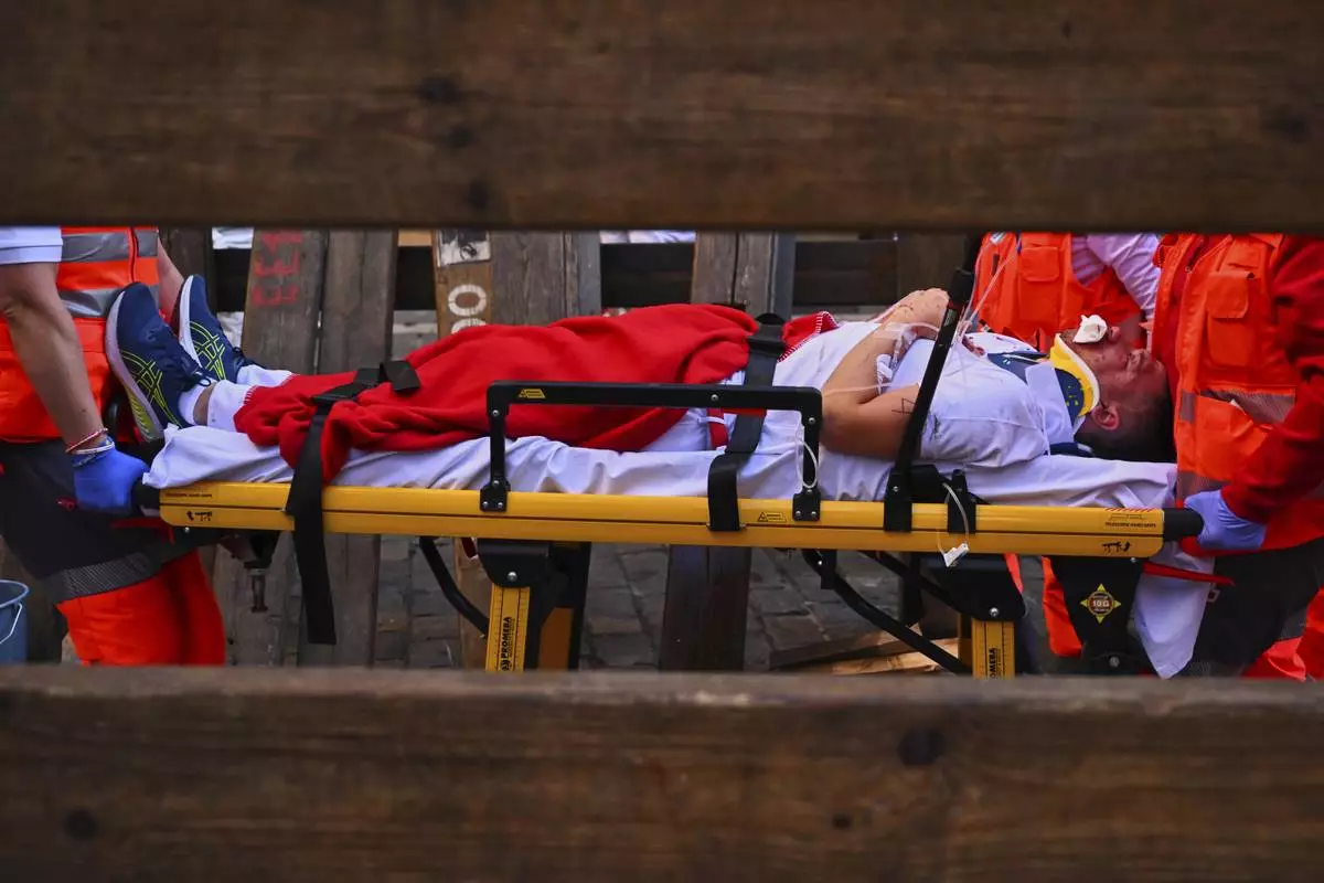 A runner who was injured during the running of the bulls is carried on a stretcher by a medical team at the San Fermín Festival in Pamplona, Spain, Thursday, July 10, 2025. (AP Photo/Miguel Oses)