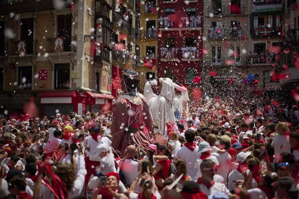Revelers gather during a performance by a troupe of giants and bigheads at the San Fermín festival in Pamplona, northern Spain, Monday, July 14, 2025. (AP Photo/Miguel Oses)