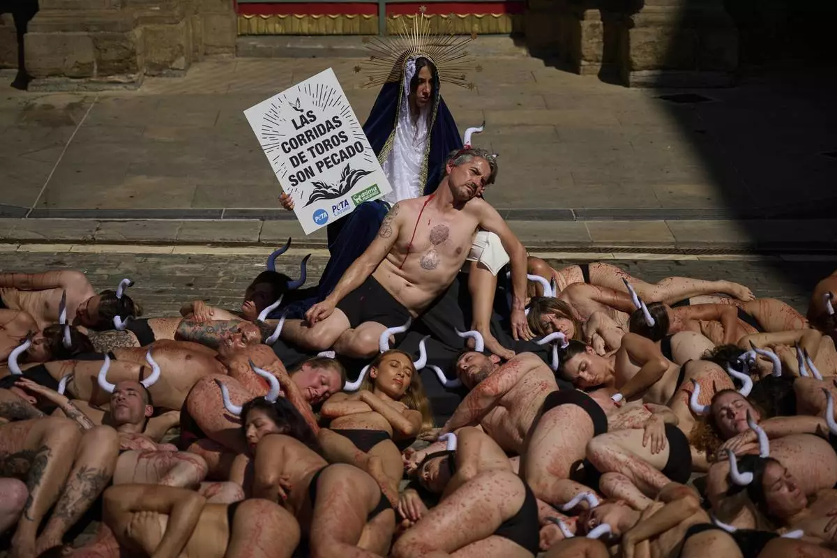 Animal rights activists, their bodies covered in blood, take part in a protest ahead of the San Fermin Festival in Pamplona, northern Spain, on Saturday, July 5, 2025. The activist dressed as the Virgin Mary holds a placard reading ''Bullfighting is a sin''. (AP Photo/Miguel Oses)