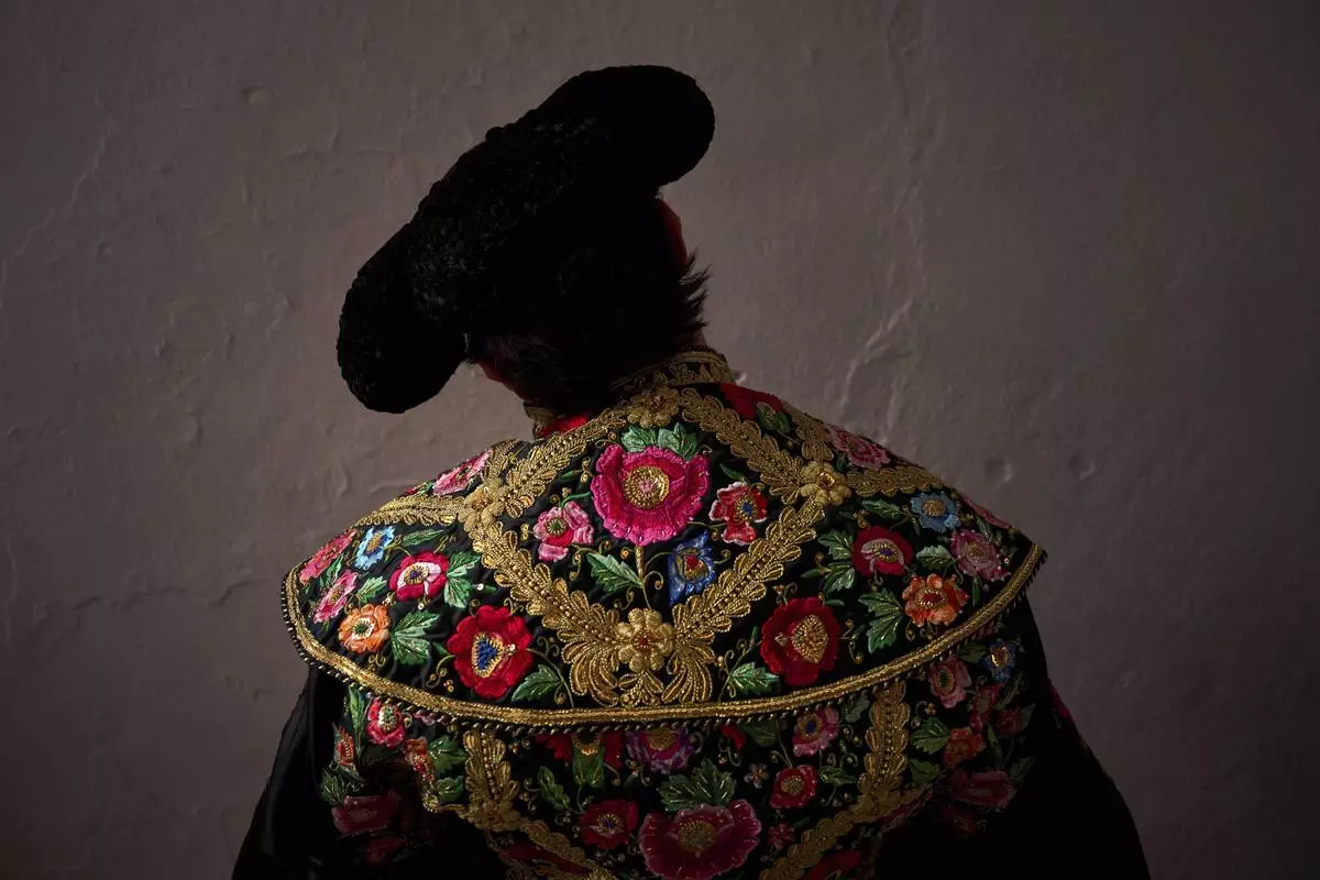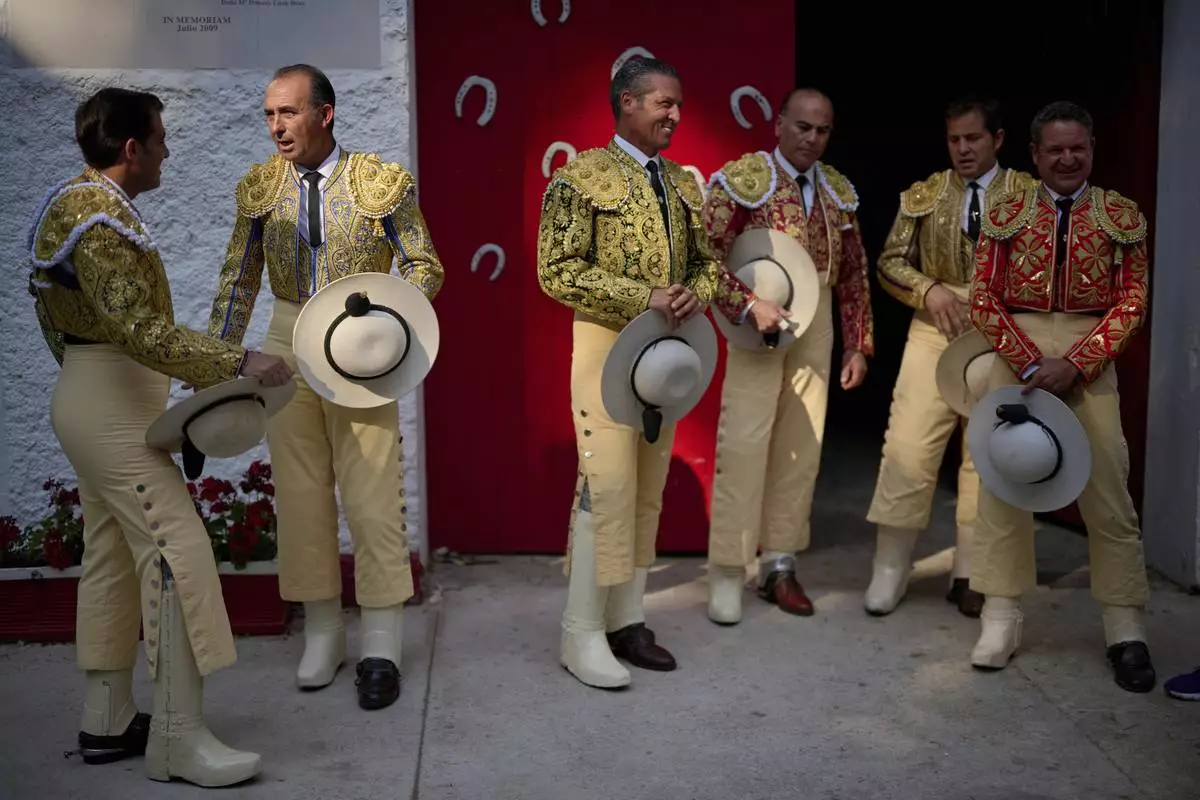 Members of the matadores' entourage gather outside the bullring during the San Fermin Festival in Pamplona, northern Spain, Thursday July 10, 2025. (AP Photo/Miguel Oses)