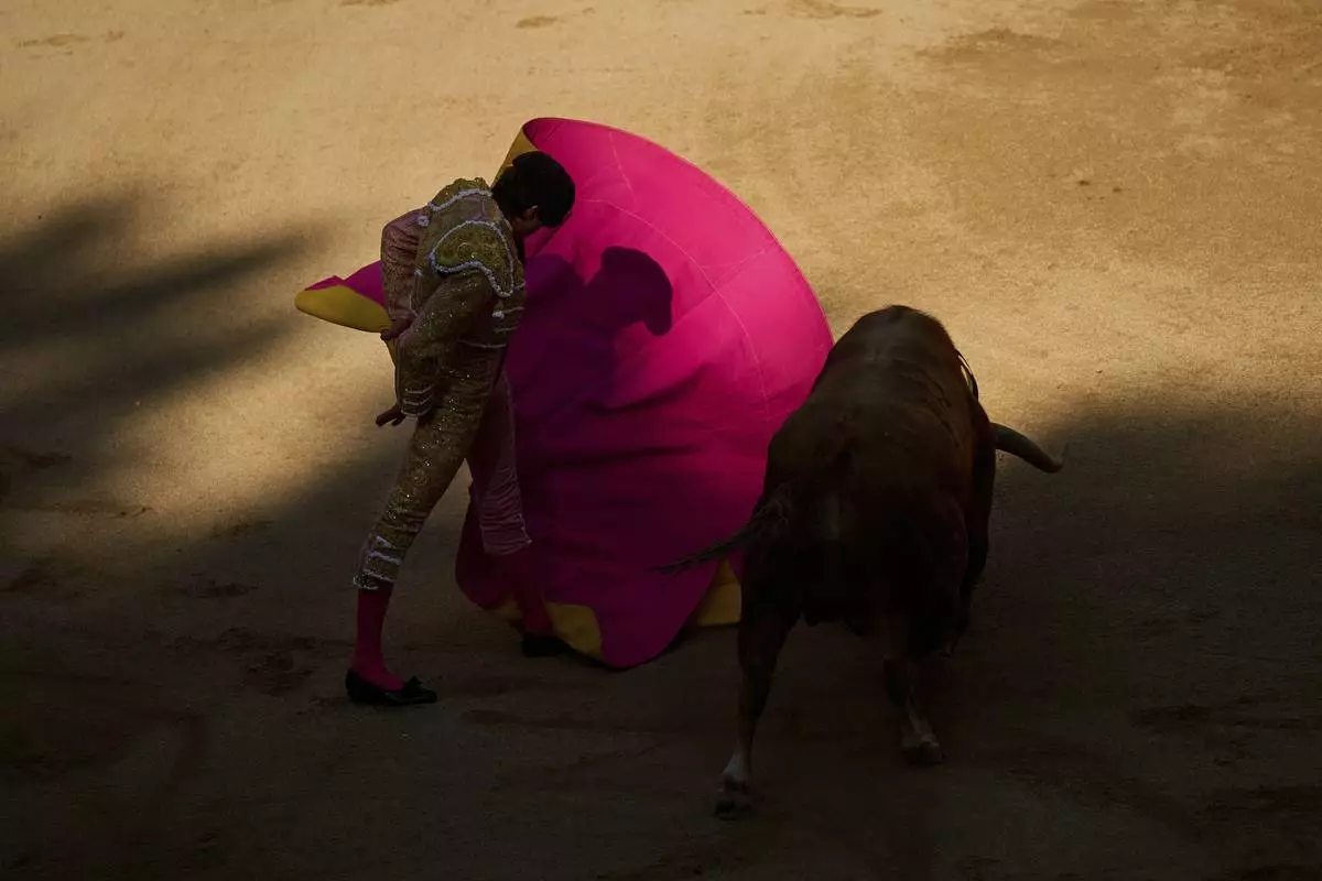 Spanish bullfighter Fernando Adrián performs during a bullfight at the San Fermín festival in Pamplona, northern Spain, Sunday, July 13, 2025. (AP Photo/Miguel Oses)