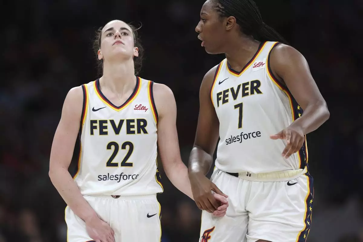 Indiana Fever's Caitlin Clark (22) reacts with a possible injury beside Aliyah Boston (7) during the second half of a WNBA basketball game against the Connecticut Sun, Tuesday, July 15, 2025, in Boston. (AP Photo/Michael Dwyer)
