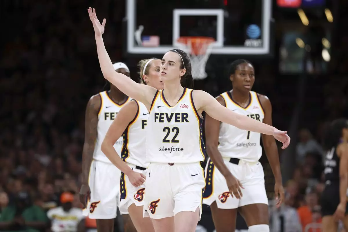 Indiana Fever's Caitlin Clark (22) gestures to the crowd during the first half of a WNBA basketball game against the Connecticut Sun Tuesday, July 15, 2025, in Boston. (AP Photo/Michael Dwyer)