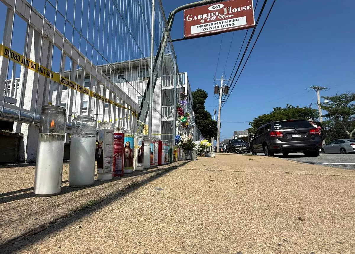 Flowers sit at a makeshift memorial in front of the Gabriel House assisted living facility, where a fire on Sunday killed several people, Wednesday, July 16, 2025 in Fall River, Mass. (AP Photo/Rodrique Ngowi)