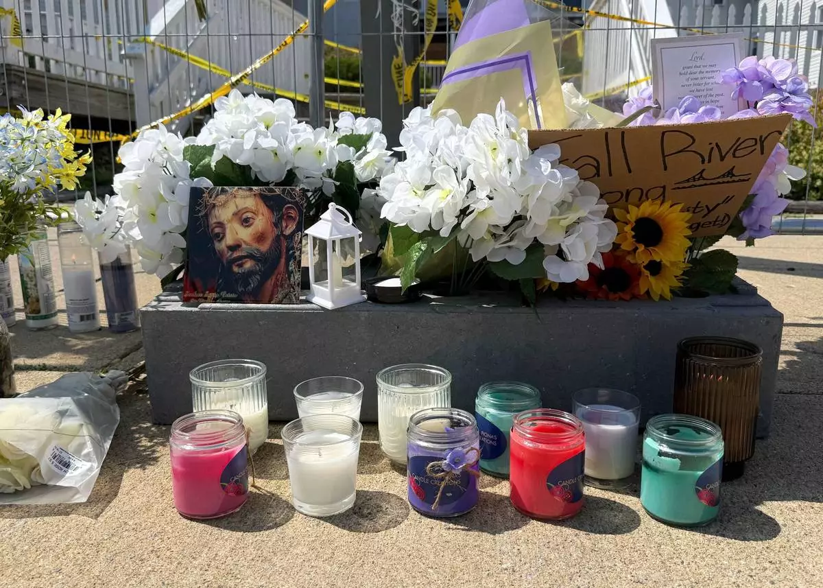 A memorial of candles and balloons that grew at the site Tuesday and Wednesday. People held a vigil there and attendees talked about the importance of community. Krista Cormier, a Fall River resident, said the fire has been “heavy on my heart all week."