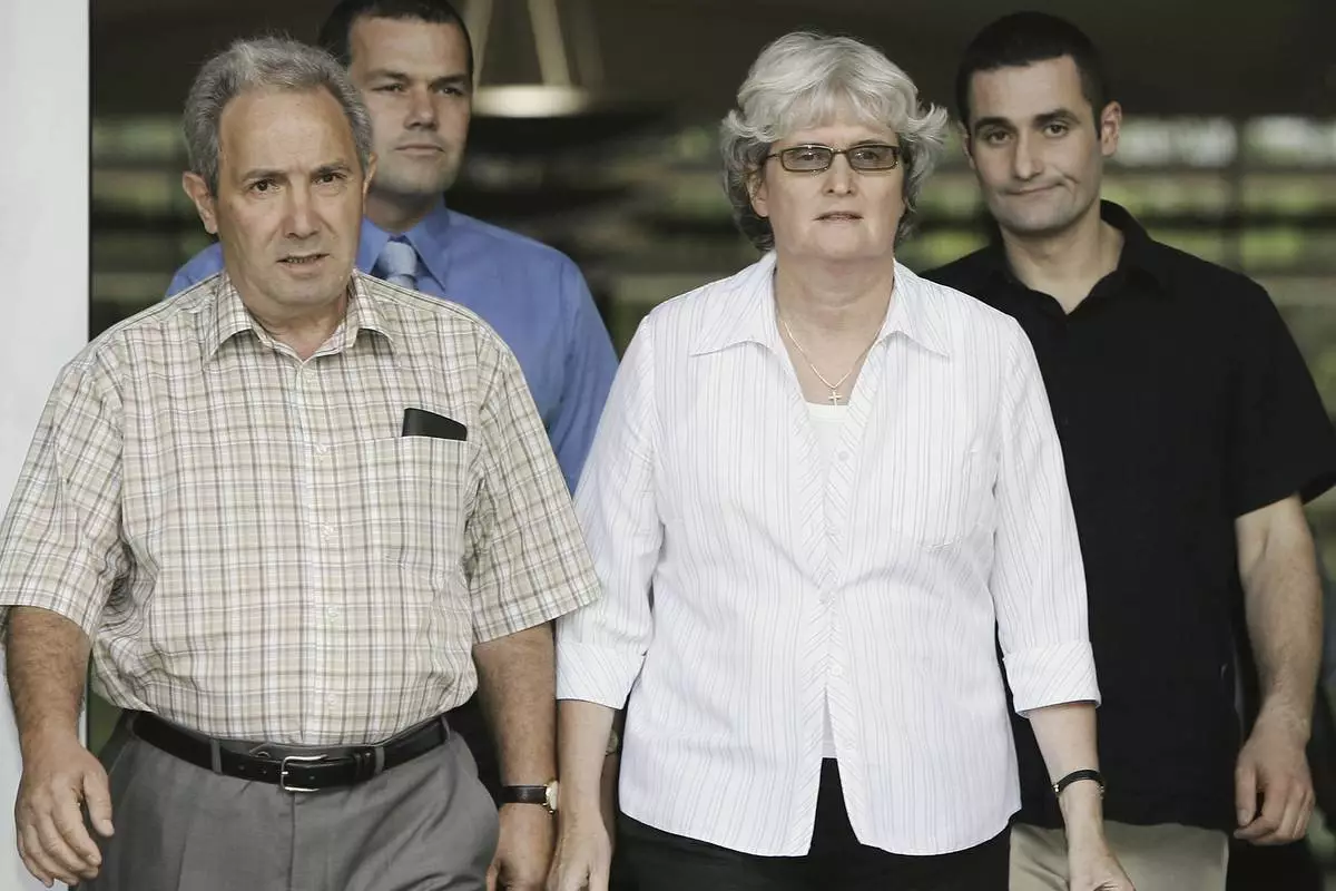 FILE - Falconio family, from left, Luciano, Nick, Joan and Paul Falconio, leave the Northern Territory Supreme Court in Darwin, Australia, Oct. 18, 2005. (AP Photo/Rob Griffith, File)