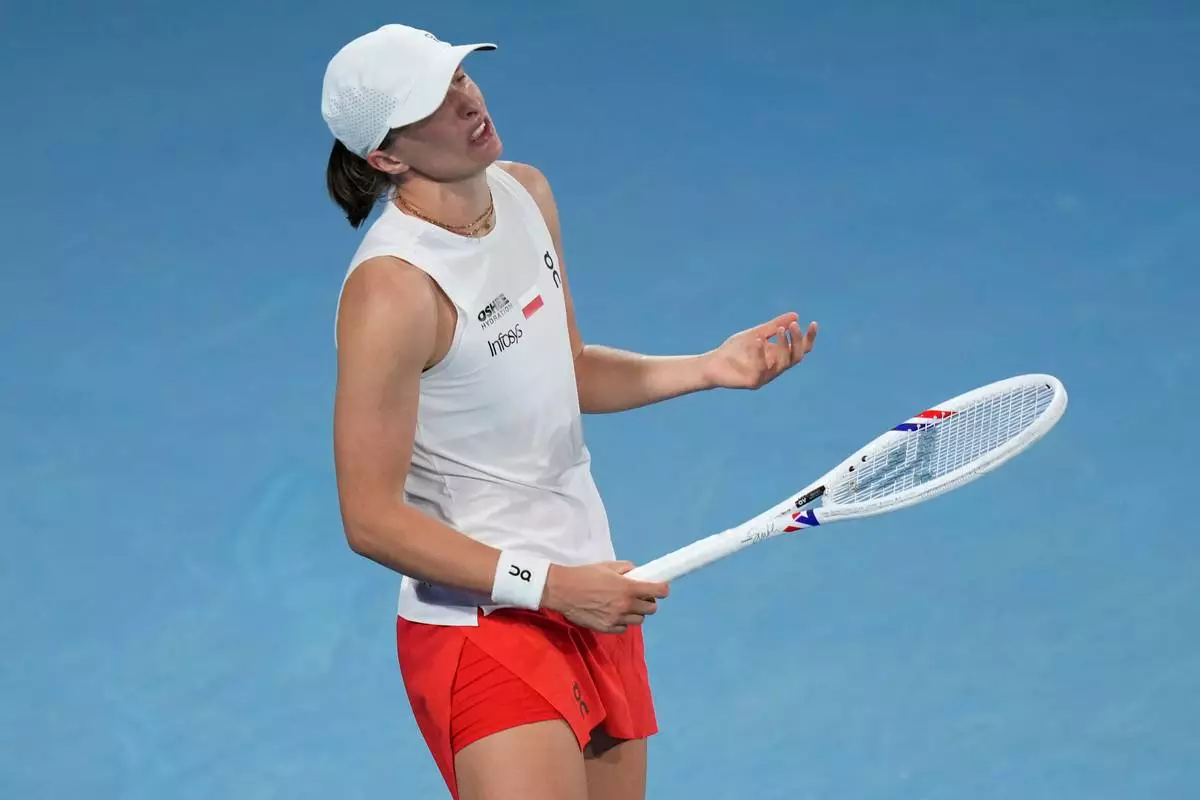 Iga Swiatek of Poland reacts after missing a shot to Coco Gauff of the U.S. in their semifinal match at the United Cup tennis tournament in Sydney, Saturday, Jan. 10, 2026. (AP Photo/Rick Rycroft)