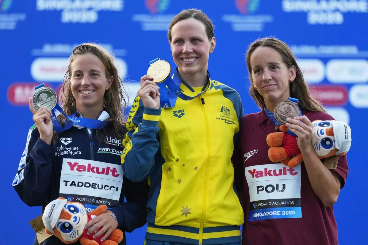 Gold medalist Australia's Moesha Johnson, centre, stands on the podium with silver medalist Ginevra Taddeucci, left, of Italy and bronze medalist Lisa Pou of Monaco following the women's 10km open water swim at the world swimming championships in Singapore, Wednesday, July 16, 2025. (AP Photo/Vincent Thian)