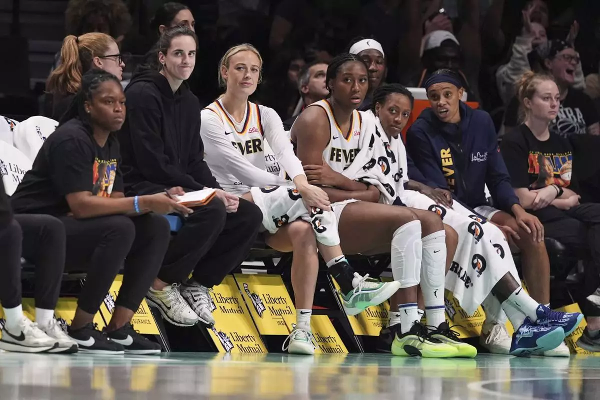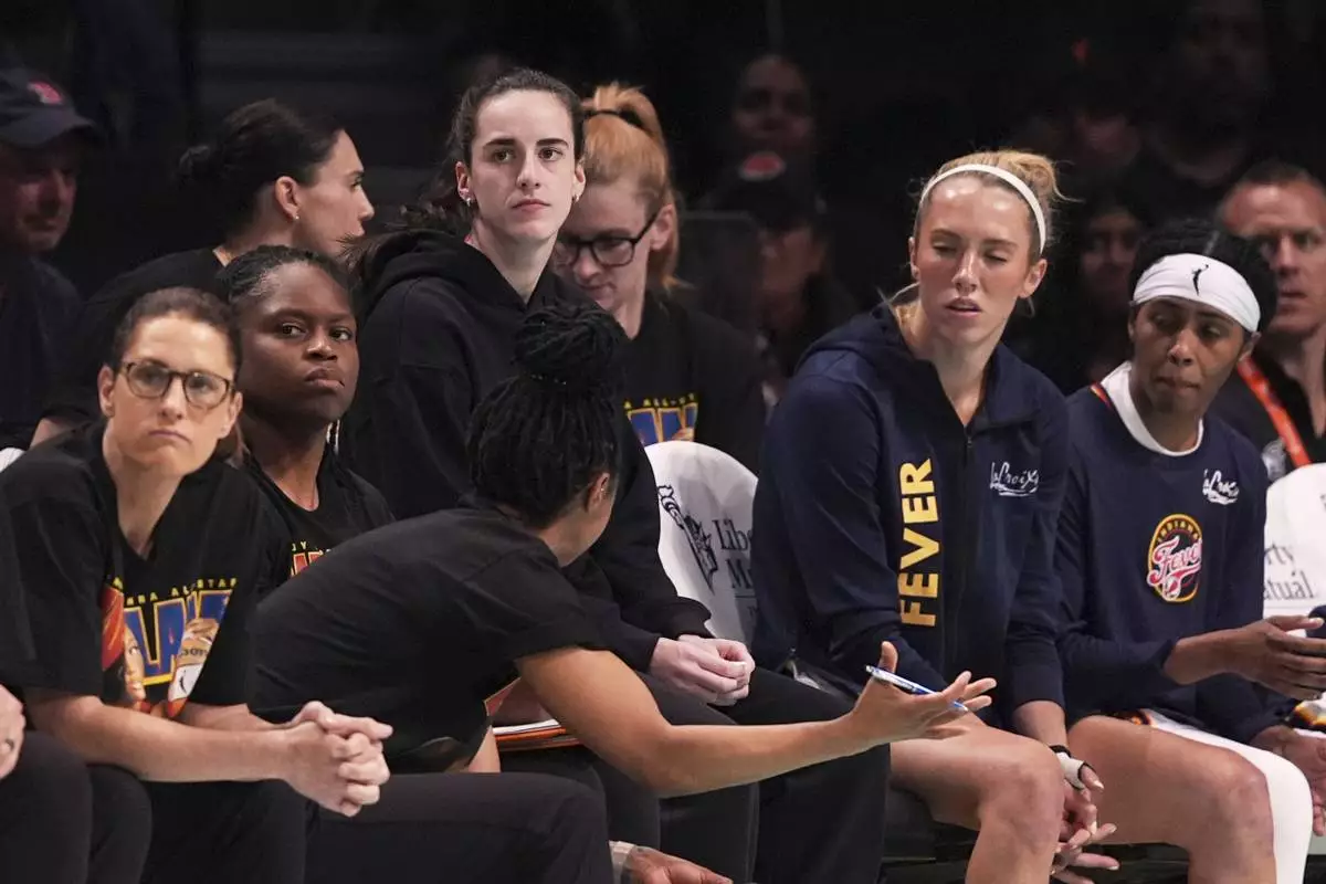 Indiana Fever's Caitlin Clark sits on the bench after an apparent injury during the second half of a WNBA basketball game against the Connecticut Sun, Tuesday, July 15, 2025, in Boston. (AP Photo/Michael Dwyer)