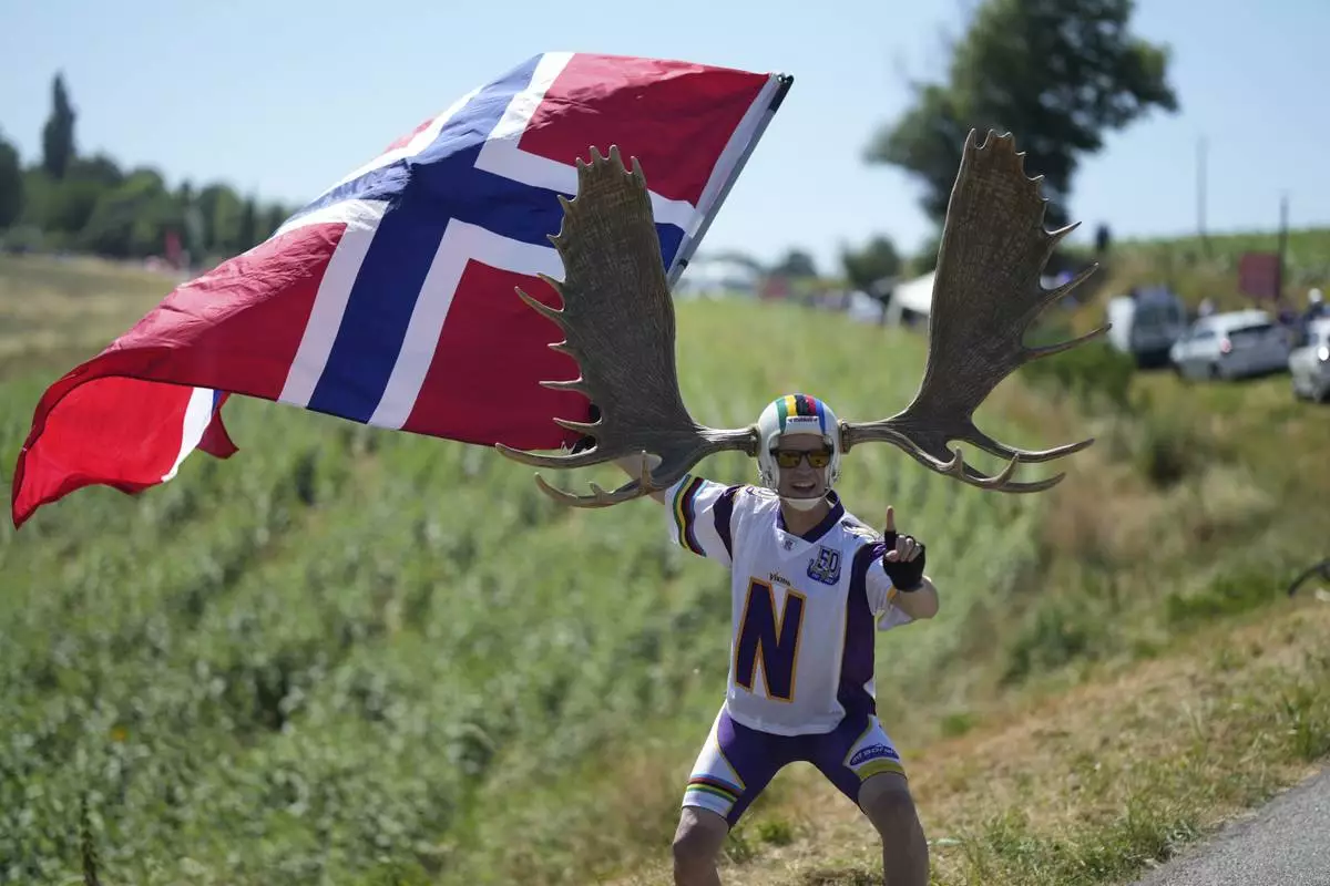 A fan holds a flag of Norway during the eleventh stage of the Tour de France cycling race over 156.8 kilometers (97.4 miles) with start and finish in Toulouse, France, Wednesday, July 16, 2025. (AP Photo/Mosa'ab Elshamy)