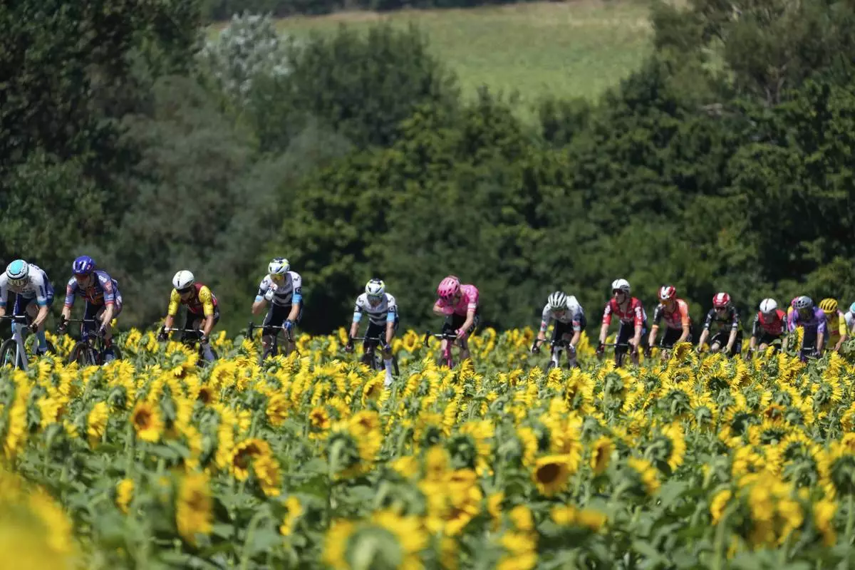 The pack rides past a field of sunflowers during the eleventh stage of the Tour de France cycling race over 156.8 kilometers (97.4 miles) with start and finish in Toulouse, France, Wednesday, July 16, 2025. (AP Photo/Mosa'ab Elshamy)