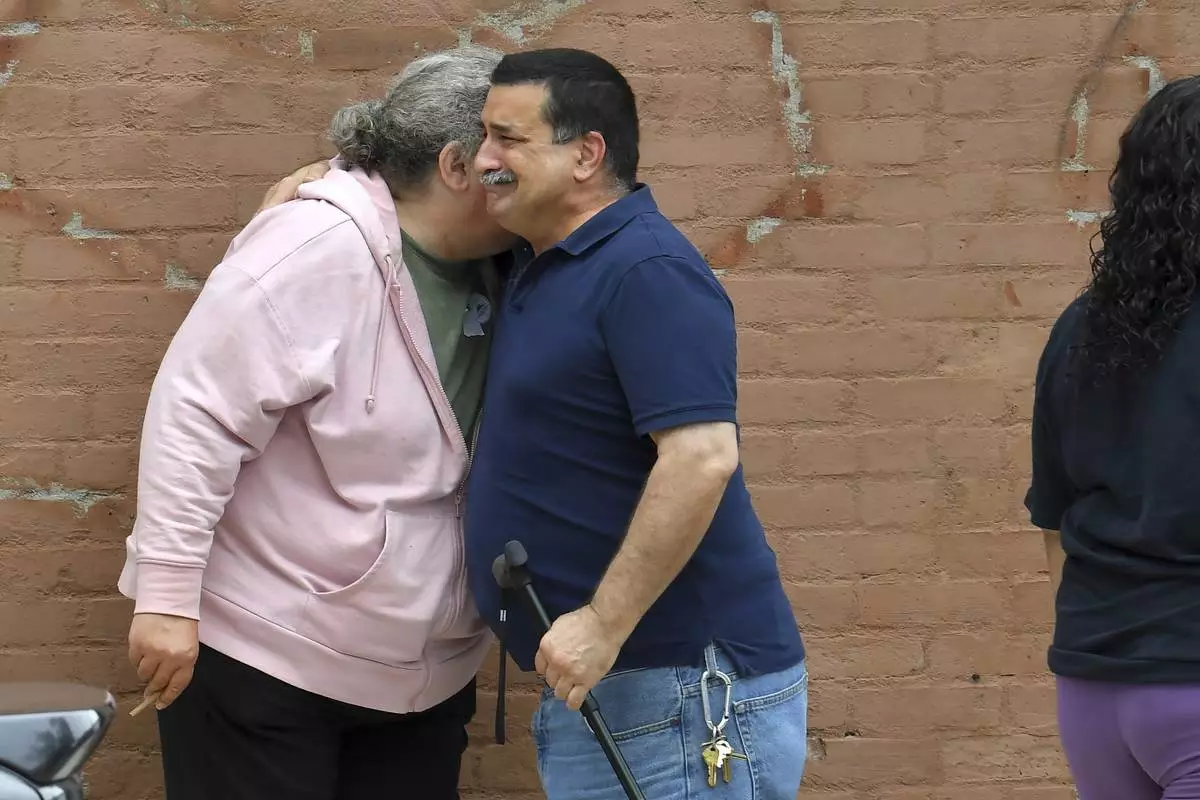 A unidentified man, right, appears emotional while embracing a resident of the Gabriel House assisted living facility, left, in Fall River, Mass., outside a temporary shelter, Monday, July 14, 2025, in Fall River, following a fire at the Gabriel House that started late Sunday and resulted in multiple fatalities. (AP Photo/Steven Senne)
