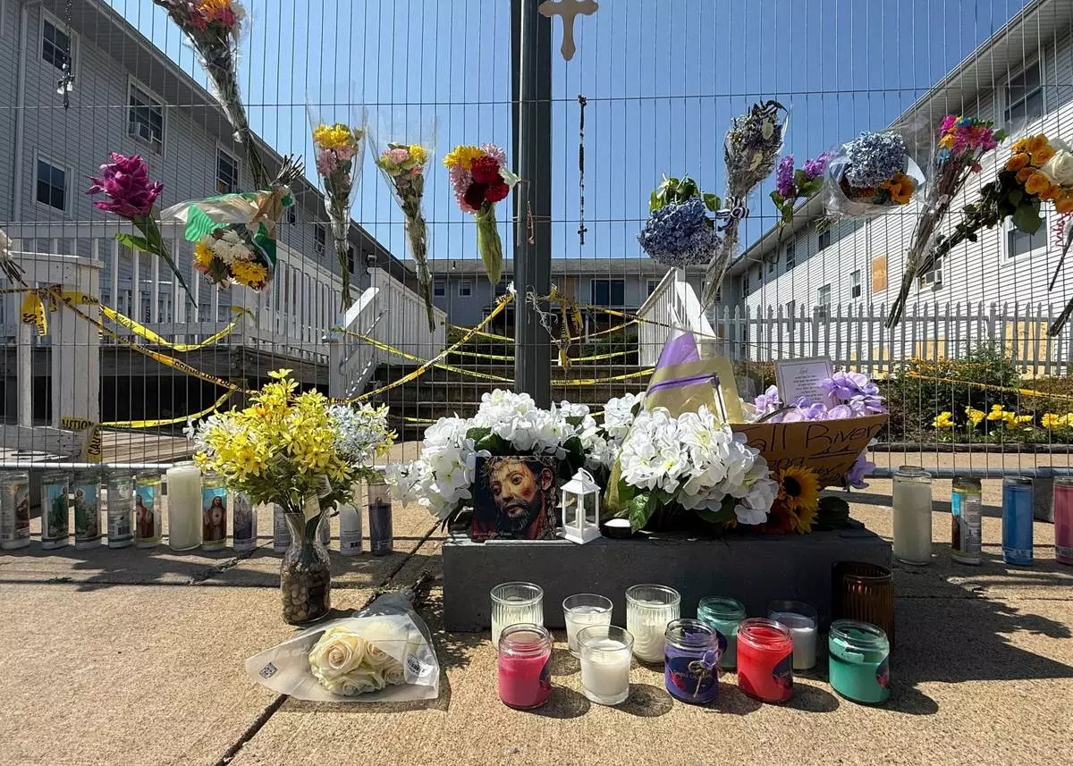 Flowers sit at a makeshift memorial in front of the Gabriel House assisted living facility, where a fire on Sunday killed several people, Wednesday, July 16, 2025 in Fall River, Mass. (AP Photo/Rodrique Ngowi)
