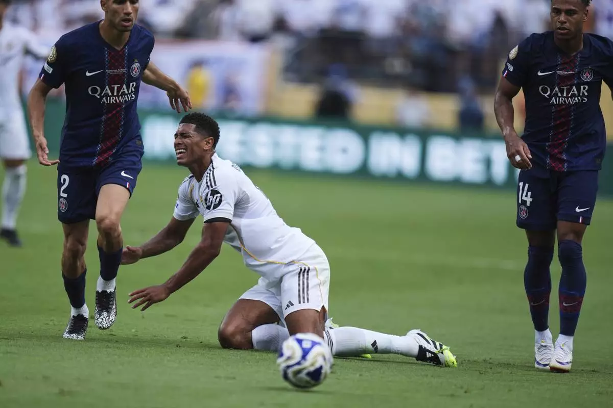 Real Madrid's Jude Bellingham (5) races after a foul during the Club World Cup semifinal soccer match between PSG and Real Madrid in East Rutherford, N.J., Wednesday, July 9, 2025. (AP Photo/Seth Wenig)
