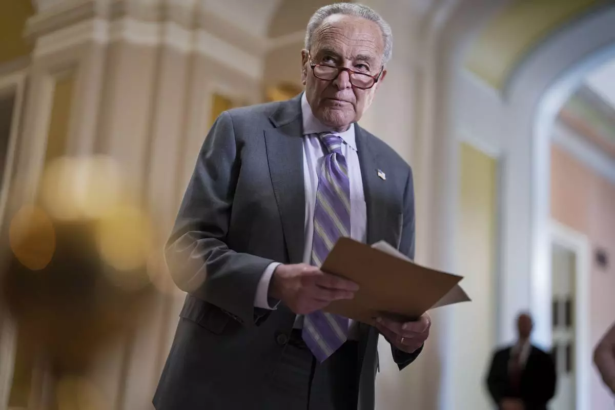 Senate Minority Leader Chuck Schumer, D-N.Y., looks over notes as Senate Republicans work to cancel $9.4 billion in previously approved spending targeted by DOGE, at the Capitol in Washington, Tuesday, July 15, 2025. (AP Photo/J. Scott Applewhite)