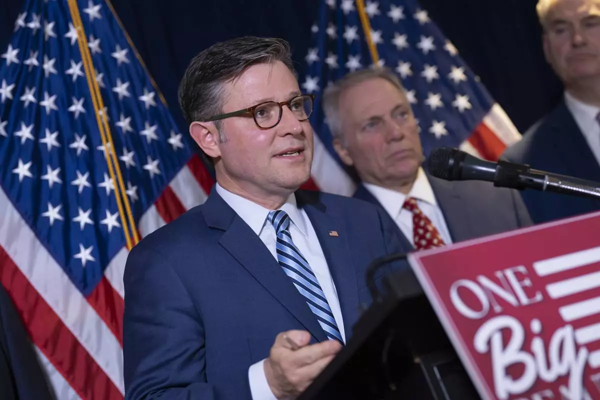Speaker of the House Mike Johnson, R-La., joined at right by Majority Leader Steve Scalise, R-La., speaks at the Republican National Committee headquarters in Washington, Tuesday, July 15, 2025. (AP Photo/J. Scott Applewhite)