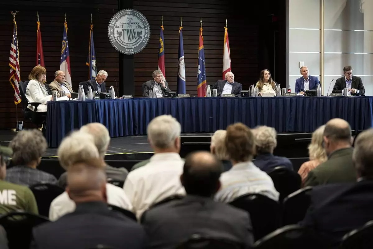 FILE - Members of the Tennessee Valley Authority Board of Directors listen to members of the public during a meeting May 8, 2024, in Nashville, Tenn. (AP Photo/George Walker IV, File)