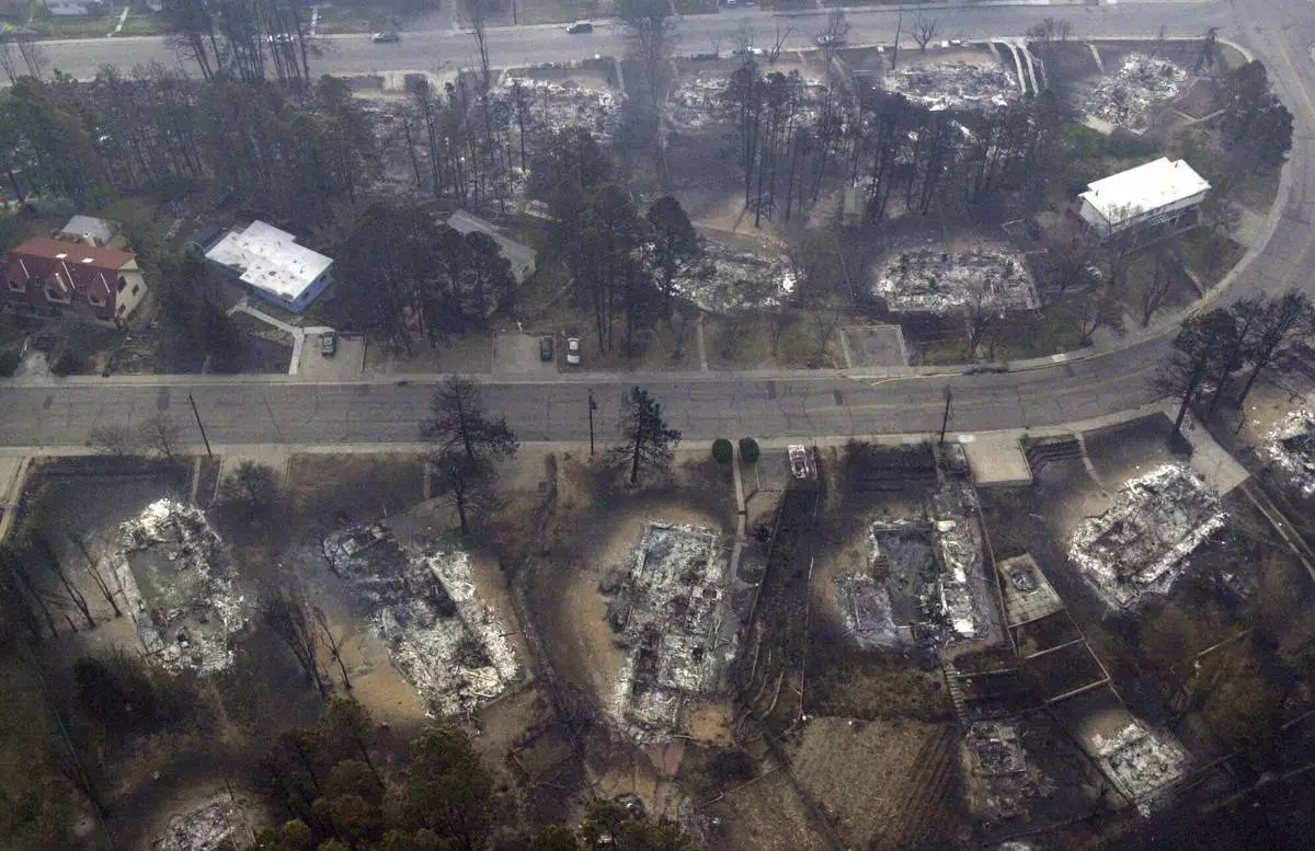 FILE - Houses that have burned to the ground by the Cerro Grande fire sit along a street in north Los Alamos, N.M., May 12, 2000. (AP Photo/Jake Schoellkopf, File)