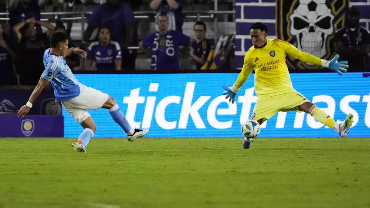 New York City FC forward Alonso Martinez, left, kicks the winning goal past Orlando City goalkeeper Pedro Gallese (1) during the second half of an MLS soccer match, Wednesday, July 16, 2025, in Orlando, Fla. (AP Photo/John Raoux)