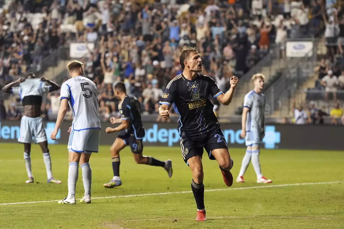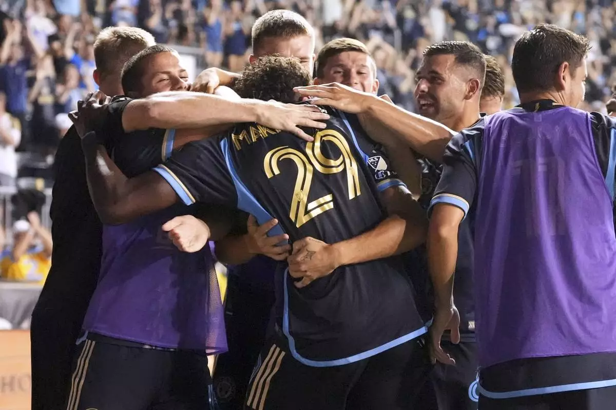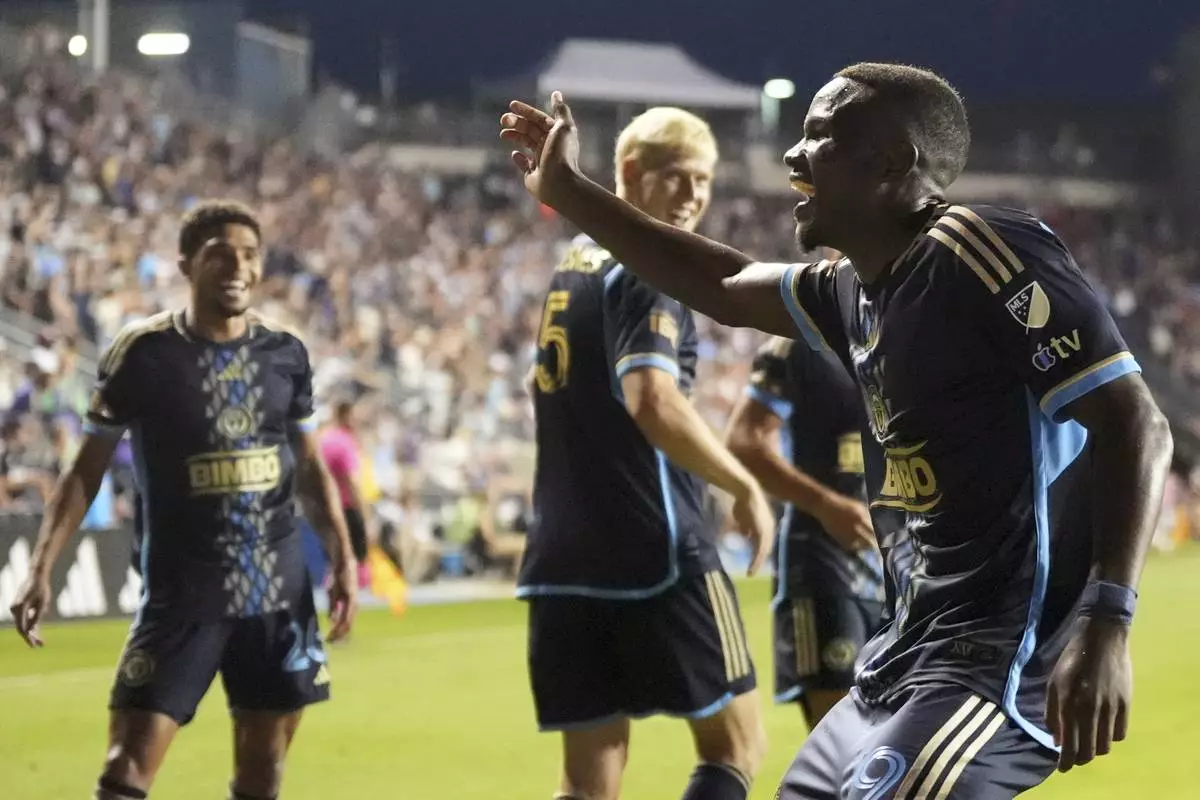 Philadelphia Union's Olwethu Makhanya celebrates with teammates after scoring a goal during the second half of an MLS soccer match against the CF Montréal, Wednesday, July 16, 2025, in Chester, Pa. (AP Photo/Matt Slocum)