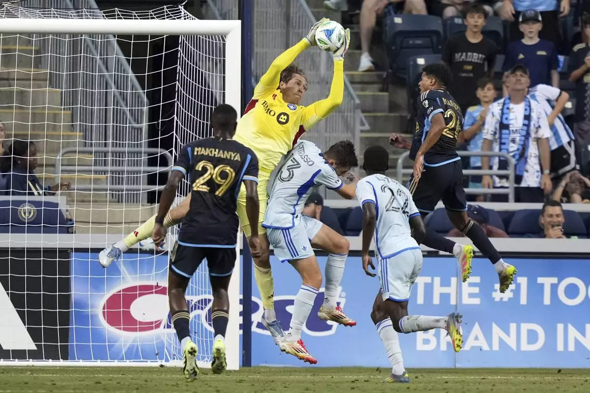 CF Montréal's Sebastian Breza, second from left, blocks a shot during the first half of an MLS soccer match against the Philadelphia Union, Wednesday, July 16, 2025, in Chester, Pa. (AP Photo/Matt Slocum)